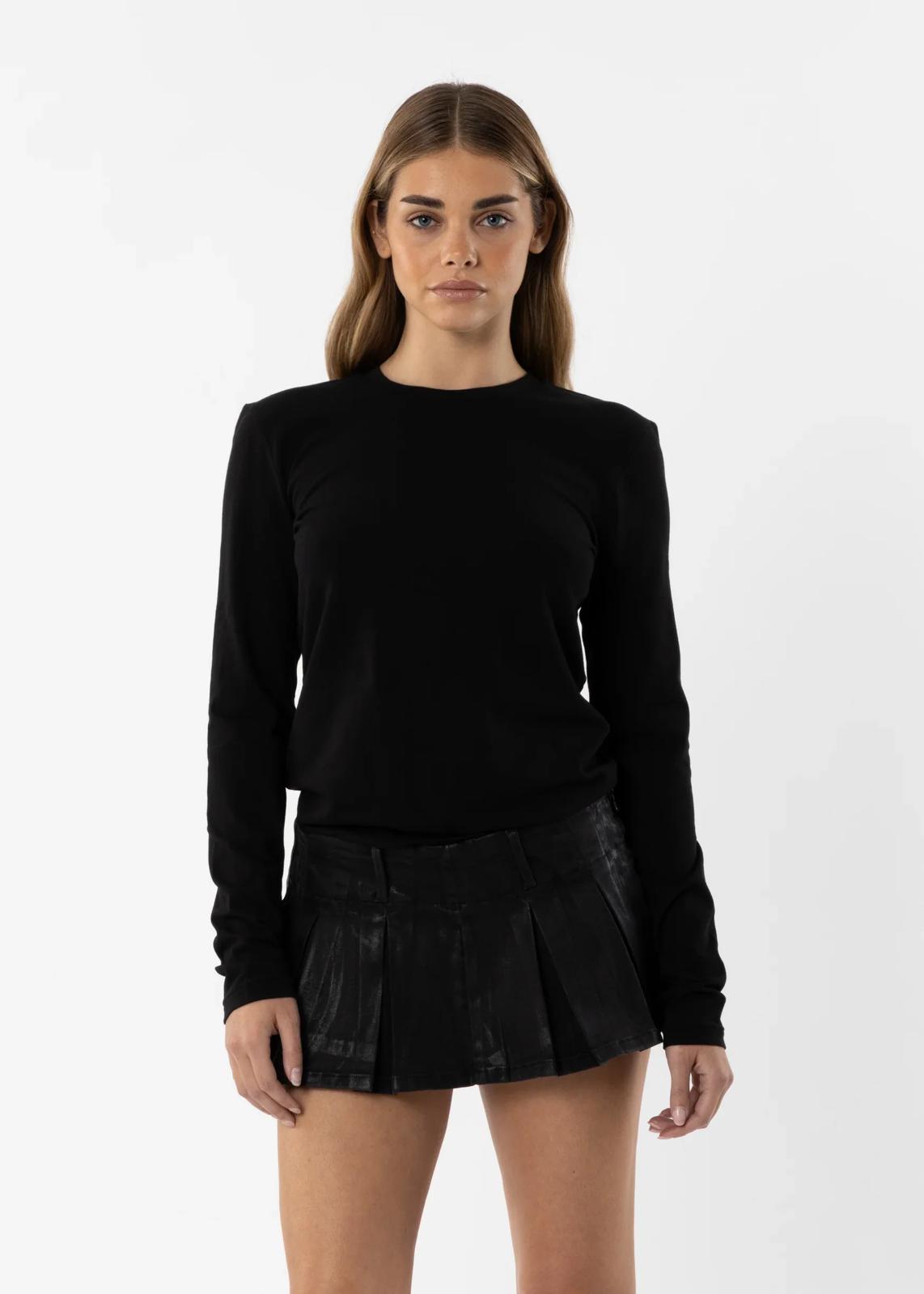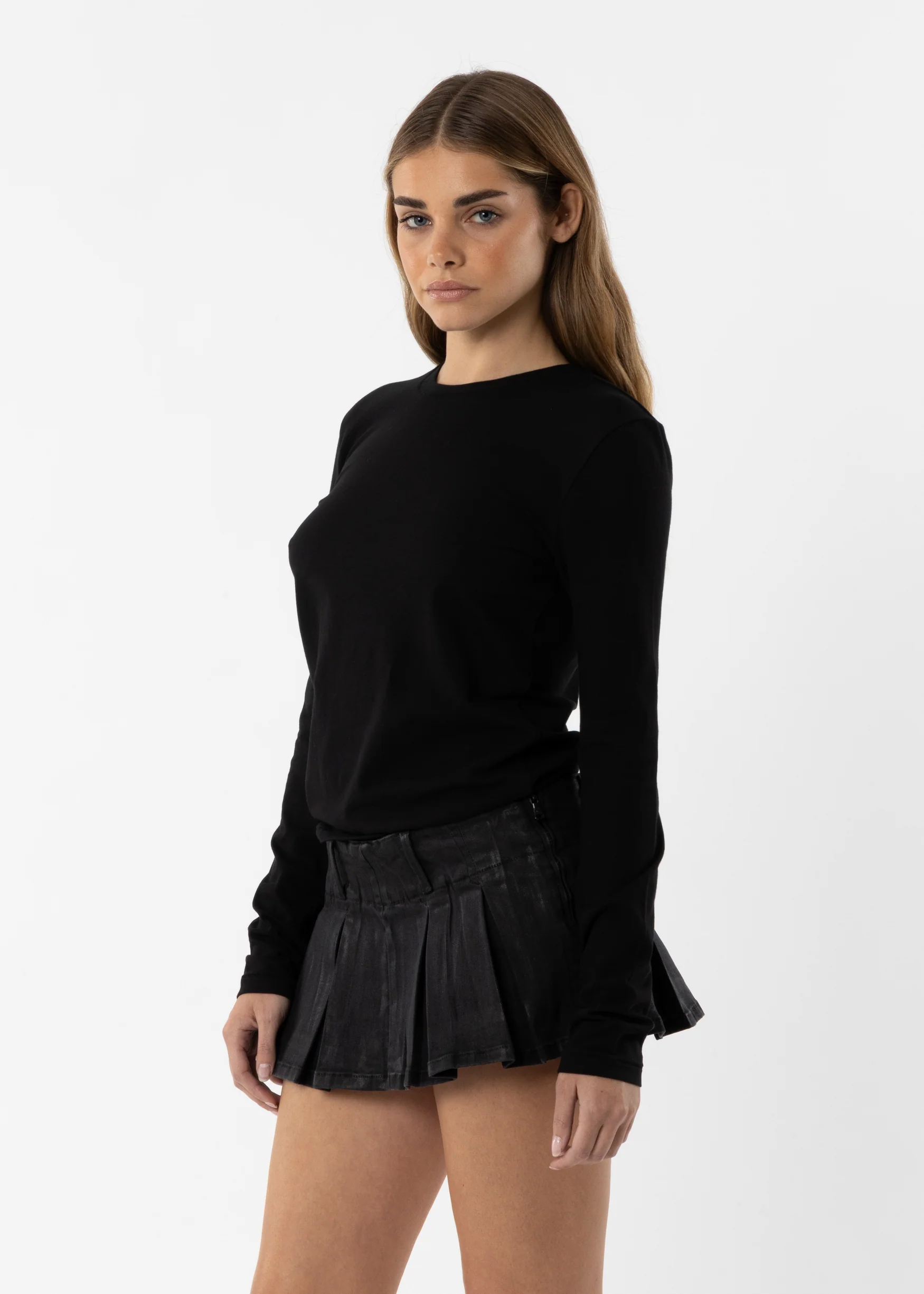 - Crew neckline with a close, sculpted fit